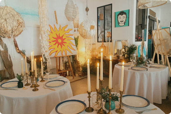 Chaque dîner met à l’honneur un ou plusieurs Artistes Invités. Peinture, sculpture, musique ou performance : les univers se mêlent le temps dʼun repas créatif et participatif, imaginé autour de produits locaux et dʼune atmosphère unique.